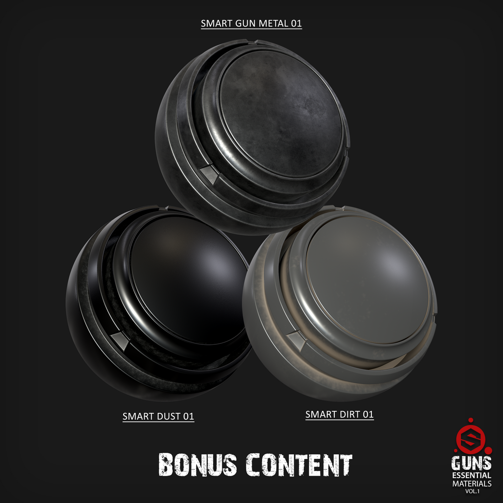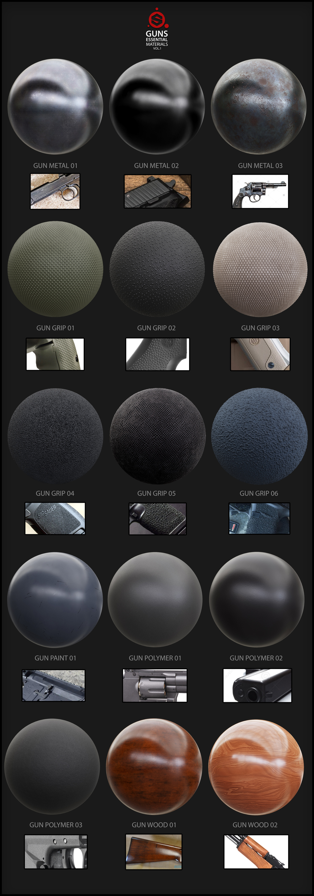12 Highly Detailed Substance Materials created to be used with Gun Texturing.